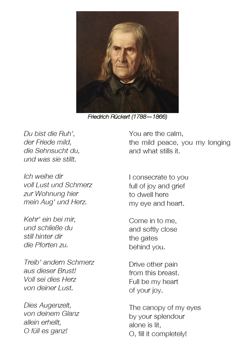 “Du bist die Ruh” is a poem by the great German poet Friederich Rückert (1788–1866). While Schubert’s setting of the poem (D. 776, Op. 59, No. 3, written in 1823) is certainly the most well-known, it is interesting to me that Fanny Mendelssohn used the same poem as part of her Opus 7, No. 4, written in 1839.